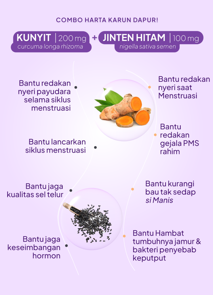kurkumin di kunyit bantu mengatur hormon & melancarkan haid, dan Jinten ada kandungan thymoquinone yang bisa meredakan nyeri haid!